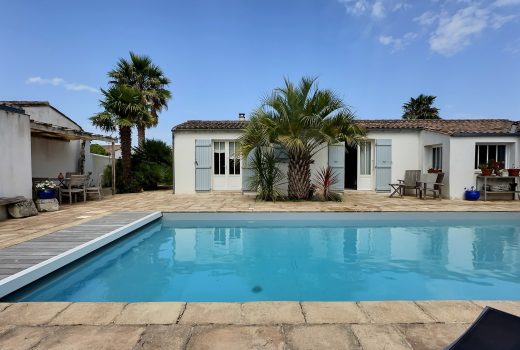 Idéalement située au calme, dans un environnement recherché à Loix, cette charmante maison de plain-pied d’environ 145 m² habitables est implantée sur une parcelle arborée de 770 m².